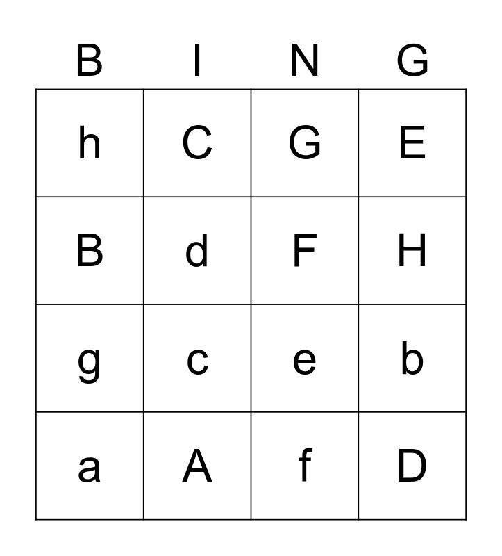 This bingo card has 16 words: A, b, G, h, g, C, e, f, B, d, a, E, c, H, F and D.