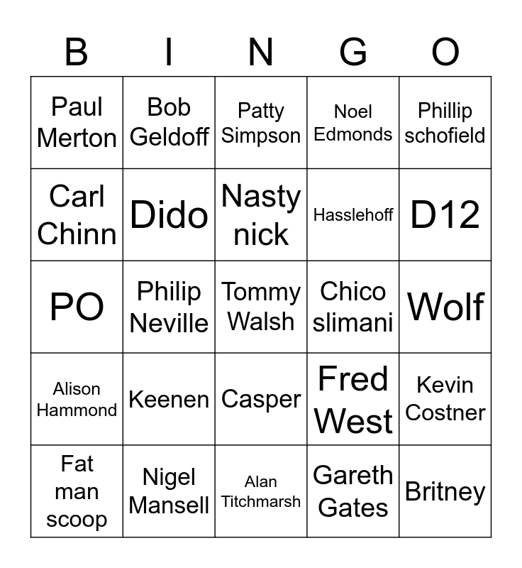 This bingo card has 51 words: FREE!, Tommy Walsh, Charlie Dimmock, Alan Titchmarsh, Keenen, Kel, Bob Geldoff, Dale Winton, Carl Chinn, Judy Murray, Dido, Noel Edmonds, Kevin Costner, Fred West, Joey Essex, Demon headmaster, Nasty nick, Chico slimani, Lerain Kelly, Phillip schofield, Philip Neville, Gareth Gates, Paul Merton, Hasslehoff, Attenborough, Britney, D12, Romeo so solid, Fat man scoop, Patty Simpson, Gnasher, James Bond, David Lewis, Andy street, Kelly Osbourne, Nigel Mansell, Zoe Dechenel, Craig Charles, Steven Hawkins, The edge, Wolf, Alison Hammond, Cher, Scholes, Rebecca Black, Jackie Weaver, PO, Andrew Marr, Sarah, Casper and Beethoven.