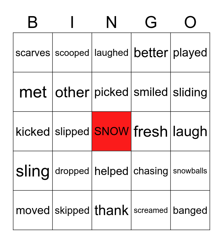 This bingo card has a free space and 24 words: dropped, skipped, picked, moved, played, scarves, met, scooped, fresh, helped, smiled, kicked, chasing, snowballs, other, screamed, laugh, laughed, sliding, slipped, banged, sling, better and thank.