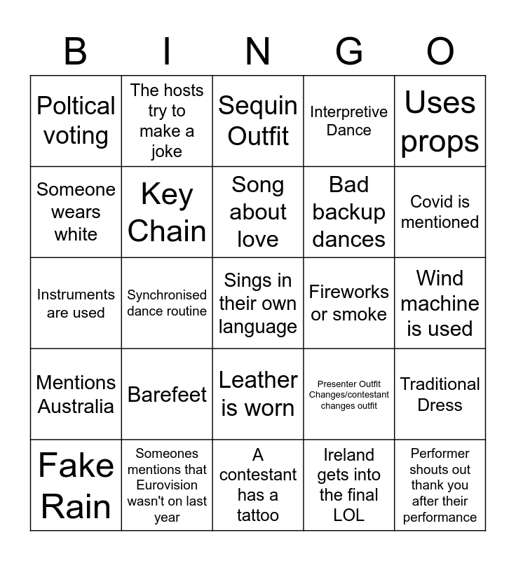 This bingo card has 30 words: Someones mentions that Eurovision wasn't on last year, Someones wears a hat or headpiece, Synchronised dance routine, 4 or more people on stage, Poltical voting, Sequin Outfit, Key Chain, Leather is worn, Fireworks or smoke, A contestant has a tattoo, Wind machine is used, Sings in their own language, Ireland gets into the final LOL, Performer shouts out thank you after their performance, Covid is mentioned, The only thing going for the act is that they are hot, Presenter Outfit Changes/contestant changes outfit, Mentions Australia, Barefeet, Uses props, Instruments are used, A recap is shown of all the contestants, The hosts try to make a joke, Bad backup dances, Someone wears white, Interpretive Dance, Traditional Dress, Fake Rain, Song about love and Song about fying.