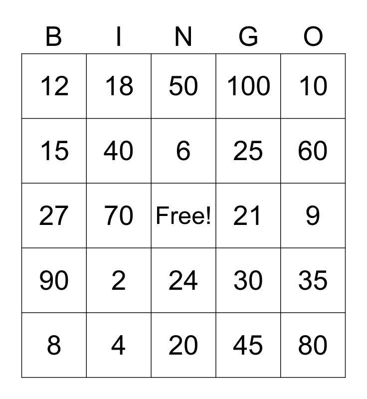 This bingo card has a free space and 24 words: 2, 4, 6, 8, 10, 12, 15, 18, 21, 24, 25, 27, 30, 35, 40, 45, 9, 50, 60, 70, 80, 90, 100 and 20.