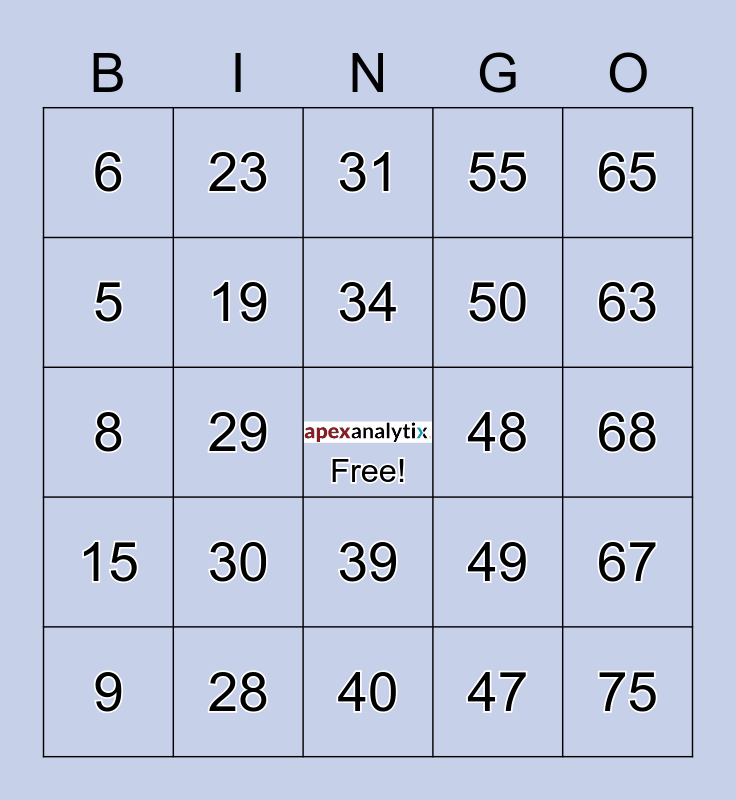 This bingo card has a free space and 75 words: 1, 16, 31, 46, 61, 2, 17, 32, 47, 62, 3, 18, 48, 63, 4, 19, 33, 49, 64, 5, 20, 34, 50, 65, 6, 21, 35, 51, 66, 7, 22, 36, 52, 67, 8, 23, 37, 53, 68, 9, 24, 38, 54, 69, 10, 25, 39, 55, 70, 11, 26, 40, 56, 71, 12, 27, 41, 57, 72, 13, 28, 42, 58, 73, 14, 29, 43, 59, 74, 15, 30, 44, 60, 75 and 45.