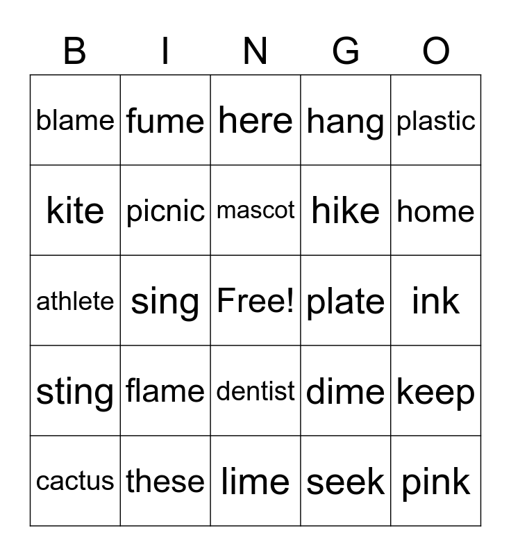 This bingo card has a free space and 39 words: trick, clock, quick, picnic, cactus, dentist, mascot, tablet, plastic, sting, sing, hang, pink, ink, plate, flame, save, blame, bike, dime, kite, lime, hike, home, broke, joke, note, cute, cube, fume, fuse, mute, here, these, seek, sleep, keep, athlete and compete.