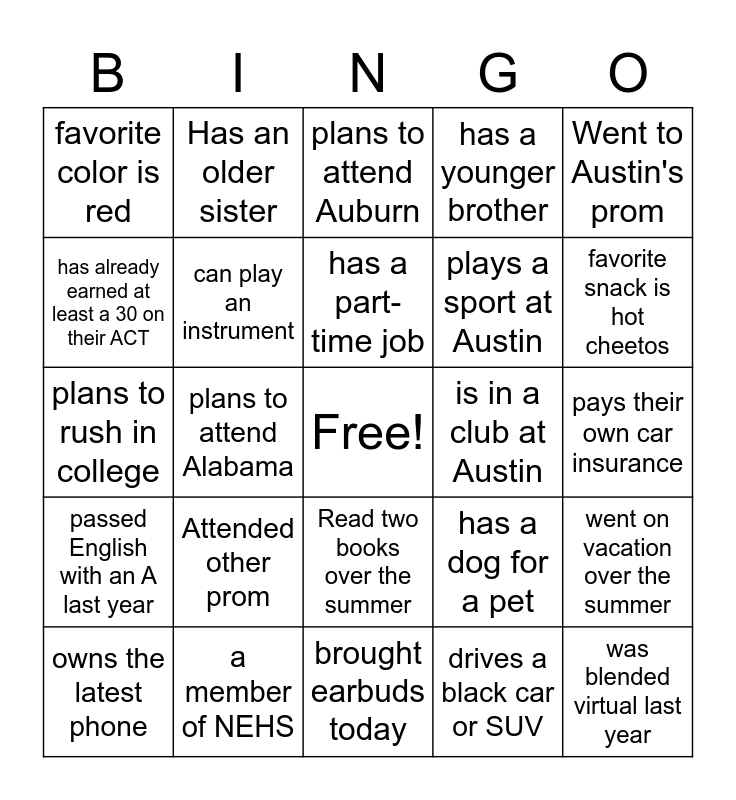 This bingo card has a free space and 24 words: Attended other prom, a member of NEHS, has a part-time job, owns the latest phone, Went to Austin's prom, favorite color is red, has already earned at least a 30 on their ACT, Has an older sister, is in a club at Austin, Read two books over the summer, plays a sport at Austin, plans to rush in college, has a dog for a pet, went on vacation over the summer, can play an instrument, drives a black car or SUV, pays their own car insurance, plans to attend Auburn, favorite snack is hot cheetos, plans to attend Alabama, was blended virtual last year, passed English with an A last year, has a younger brother and brought earbuds today.