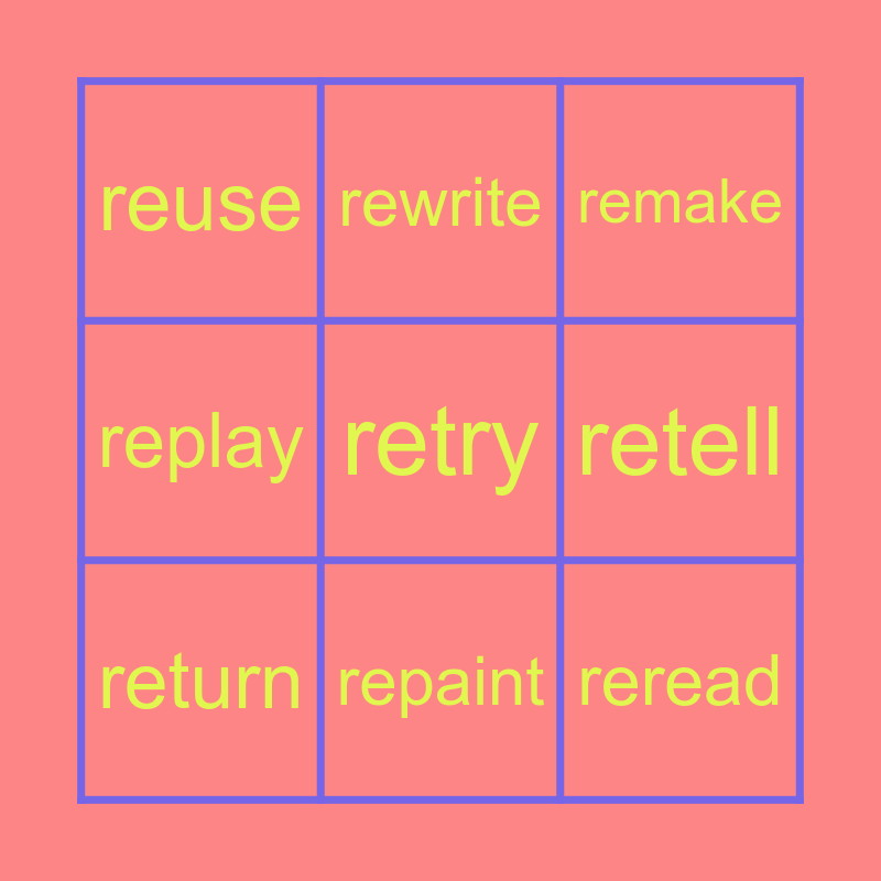 This bingo card has a free space and 8 words: retell, remake, rewrite, return, reuse, reread, replay and repaint.