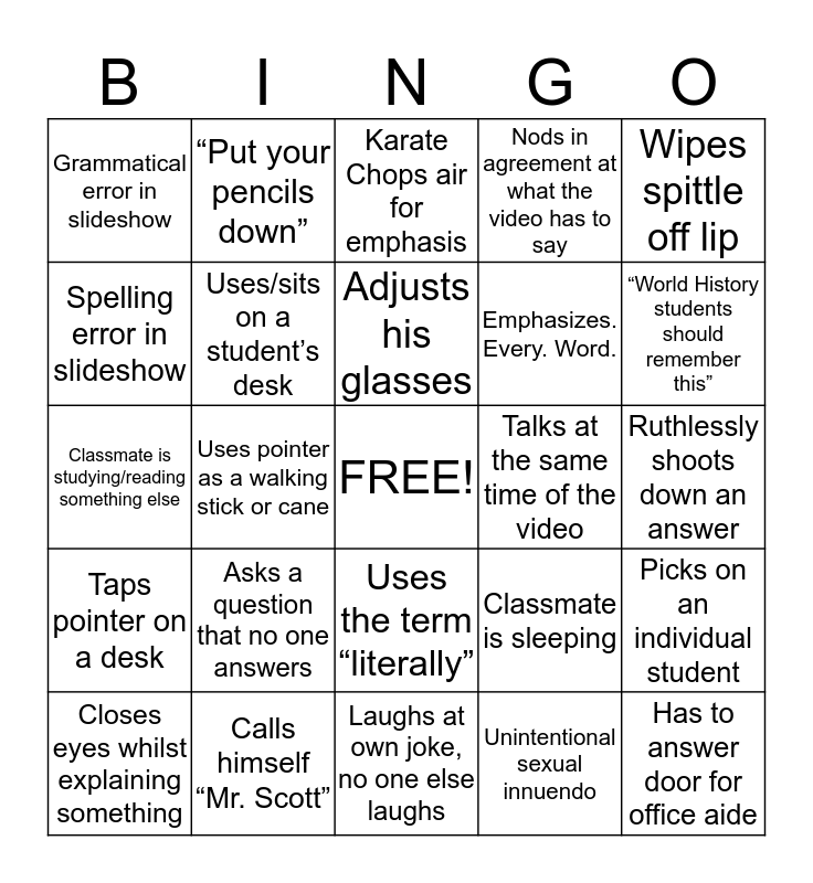 This bingo card has a free space and 24 words: Asks a question that no one answers, Calls himself “Mr. Scott”, Adjusts his glasses, Closes eyes whilst explaining something, Wipes spittle off lip, Grammatical error in slideshow, Spelling error in slideshow, “Put your pencils down”, Talks at the same time of the video, Uses the term “literally”, Emphasizes. Every. Word., Classmate is studying/reading something else, Classmate is sleeping, Picks on an individual student, Uses/sits on a student’s desk, Unintentional sexual innuendo, Ruthlessly shoots down an answer, Karate Chops air for emphasis, “World History students should remember this”, Uses pointer as a walking stick or cane, Has to answer door for office aide, Taps pointer on a desk, Nods in agreement at what the video has to say and Laughs at own joke, no one else laughs.