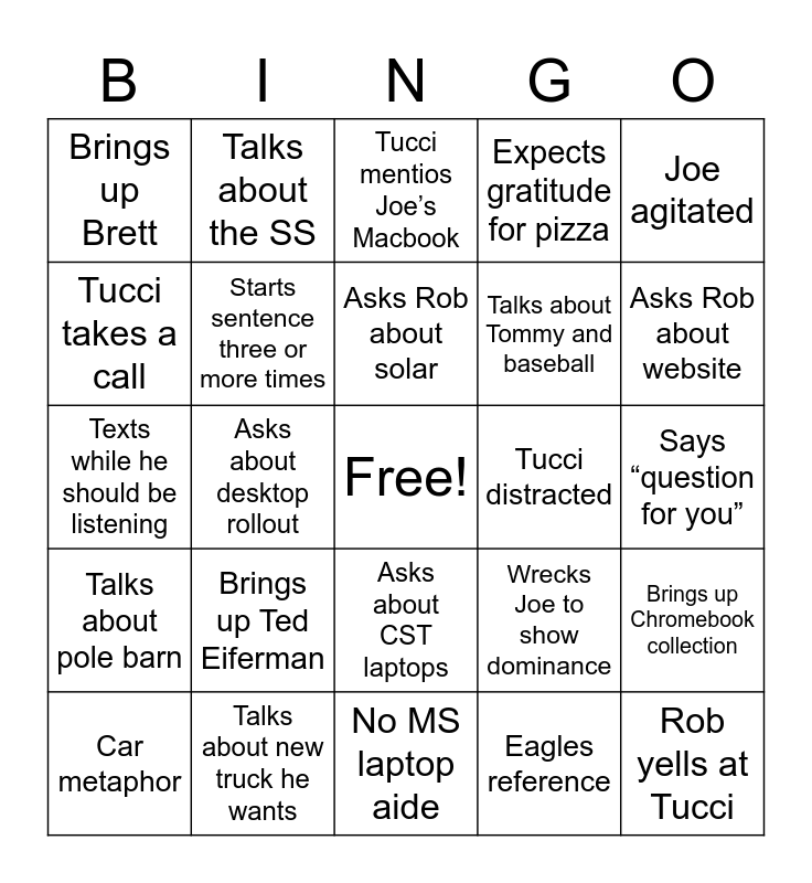 This bingo card has a free space and 29 words: Car metaphor, Bus depot mention, No MS laptop aide, Eagles reference, Joe agitated, Tucci takes a call, Talks about the SS, Tucci misquotes a movie, Tucci distracted, Rob yells at Tucci, Texts while he should be listening, Starts sentence three or more times, Plays with mics, Wrecks Joe to show dominance, Says “question for you”, Defends Shawnequa, Asks about desktop rollout, Asks about CST laptops, Expects gratitude for pizza, Brings up Chromebook collection, Talks about pole barn, Talks about new truck he wants, Asks Rob about solar, Talks about Tommy and baseball, Asks Rob about website, Brings up Brett, Brings up Ted Eiferman, Tucci mentios Joe’s Macbook and Beaver makes Tucci mad.