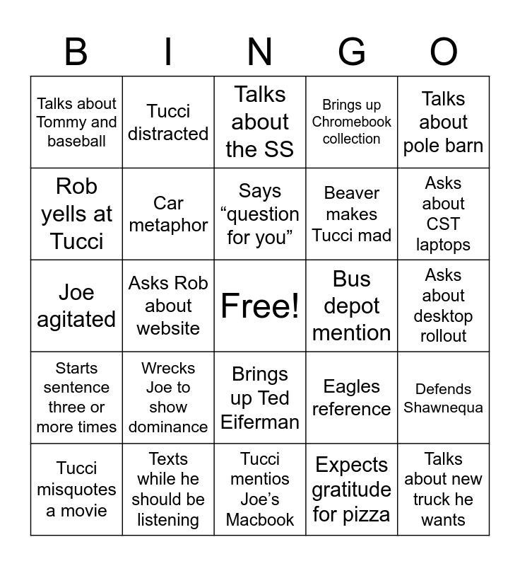This bingo card has a free space and 29 words: Tucci misquotes a movie, No MS laptop aide, Asks Rob about website, Asks Rob about solar, Talks about Tommy and baseball, Talks about the SS, Car metaphor, Wrecks Joe to show dominance, Bus depot mention, Texts while he should be listening, Asks about desktop rollout, Talks about new truck he wants, Tucci mentios Joe’s Macbook, Expects gratitude for pizza, Asks about CST laptops, Tucci takes a call, Brings up Ted Eiferman, Starts sentence three or more times, Talks about pole barn, Joe agitated, Eagles reference, Plays with mics, Beaver makes Tucci mad, Rob yells at Tucci, Brings up Chromebook collection, Tucci distracted, Defends Shawnequa, Says “question for you” and Brings up Brett.