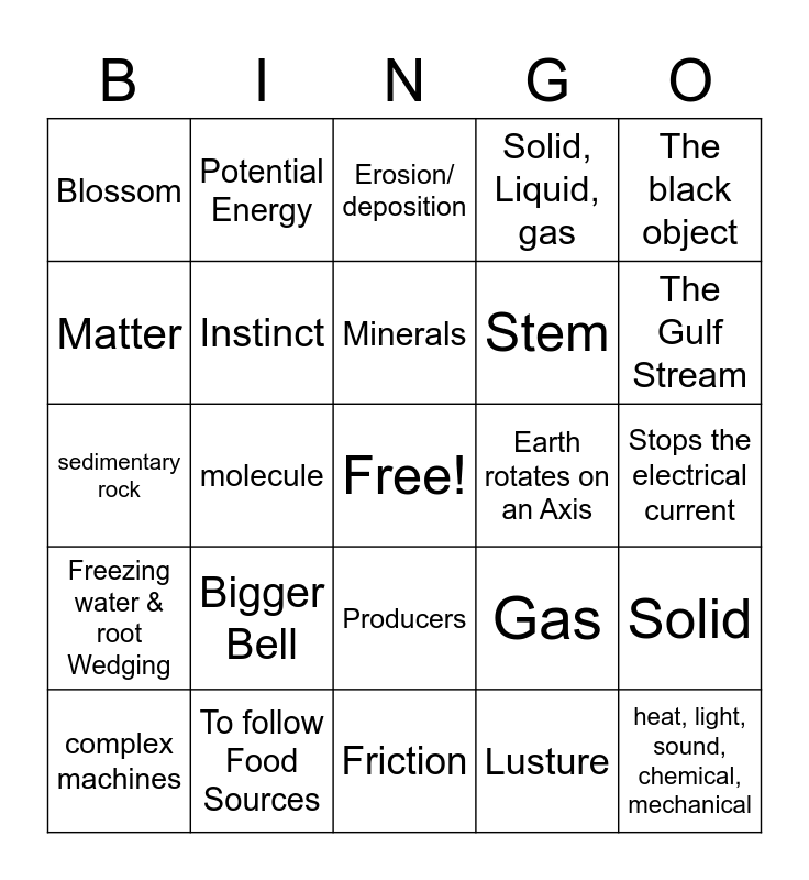 This bingo card has a free space and 50 words: oil, gas, coal, nuclear, heat, light, sound, chemical, mechanical, Rubber, Plastic, Friction, Bigger Bell, Parallel Circuit, Potential Energy, Static Electricity, Matter, One Year (365&1/4 days), Instinct, Solid, Liquid, gas, Solid, Gas, 28 Days, Water, Wind, Solar, Minerals, Earth rotates on an Axis, Sun, The black object, molecule, Lusture, Blossom, Stem, sun, water, co2, magnet, The Gulf Stream, iron, Erosion/ deposition, Producers, Tundra, Reproduction, Decomposers, 97%, To follow Food Sources, egg tadpole froglet, water decomposers, vertebrates, Simple Machines, Stops the electrical current, shorter string, water, pan, horseshoe, nail, allows electricity to flow through, vibrations in the air called sound wavers, complex machines, sedimentary rock, East to West, Invertebrates, Freezing water & root Wedging and To identify organisms from long ago.