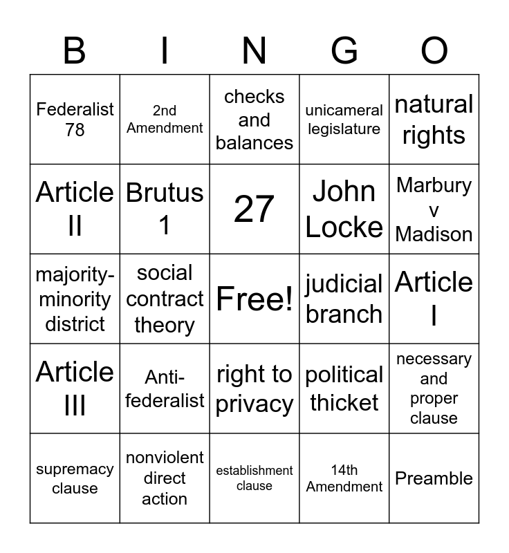 This bingo card has a free space and 38 words: Federalist 10, pluralism, factions, Brutus 1, necessary and proper clause, Anti-federalist, 27, Bill of Rights, natural rights, John Locke, social contract theory, unicameral legislature, Preamble, Article I, Article II, Article III, Federalist 51, checks and balances, single, "energetic" executive, judicial branch, Federalist 78, nonviolent direct action, Marbury v Madison, supremacy clause, US v Lopez, establishment clause, free exercise clause, symbolic speech, prior restraint, free speech, 6th Amendment, right to privacy, 14th Amendment, 2nd Amendment, Plessy v Ferguson, political thicket, majority-minority district and Citizens United v FEC.