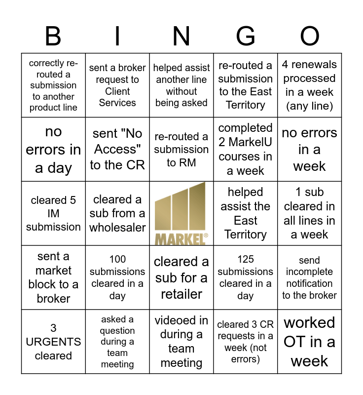 This bingo card has a free space and 24 words: 100 submissions cleared in a day, asked a question during a team meeting, re-routed a submission to RM, 3 URGENTS cleared, 4 renewals processed in a week (any line), correctly re-routed a submission to another product line, no errors in a day, sent a broker request to Client Services, helped assist the East Territory, cleared a sub for a retailer, completed 2 MarkelU courses in a week, cleared 5 IM submission, 125 submissions cleared in a day, send incomplete notification to the broker, sent "No Access" to the CR, cleared 3 CR requests in a week (not errors), 1 sub cleared in all lines in a week, helped assist another line without being asked, no errors in a week, cleared a sub from a wholesaler, worked OT in a week, sent a market block to a broker, re-routed a submission to the East Territory and videoed in during a team meeting.