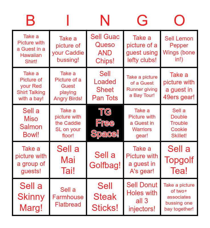This bingo card has a free space and 24 words: Sell a Mai Tai!, Sell a Farmhouse Flatbread, Sell Loaded Sheet Pan Tots, Sell a Skinny Marg!, Sell Lemon Pepper Wings (bone in!), Take a Picture with a Guest in a Hawaiian Shirt!, Take a Picture of your Red Shirt Talking with a bay!, Take a picture of your Caddie bussing!, Take a Picture with a Guest in Warriors gear!, Sell a Golfbag!, Take a picture of a Guest Runner giving a Bay Tour!, Sell a Miso Salmon Bowl!, Take a Picture with a guest in A's gear!, Sell a Topgolf Tea!, Take a Picture of a Guest playing Angry Birds!, Sell Donut Holes with all 3 injectors!, Sell a Double Trouble Cookie Skillet!, Sell Guac Queso AND Chips!, Take a picture with a guest in 49ers gear!, Take a picture with the Caddie SL on your floor!, Take a picture of two+ associates bussing one bay together!, Take a picture with a group of guests!, Take a picture of a guest using lefty clubs! and Sell Steak Sticks!.
