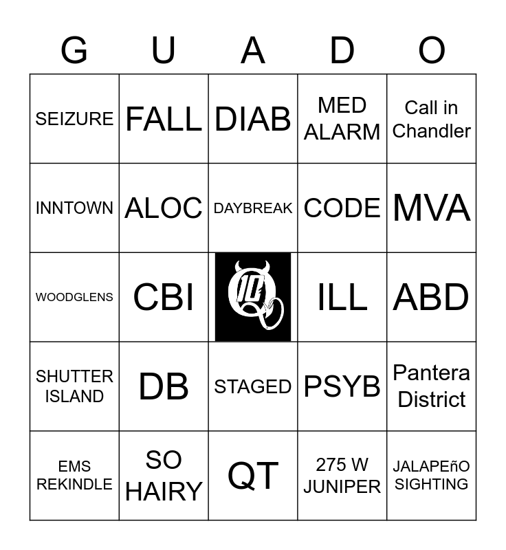 This bingo card has a free space and 30 words: SO HAIRY, INJ, CBI, ASSAULT, SEIZURE, DIAB, ALOC, STAGED, ILL, QT, ABD, JALAPEñO SIGHTING, 275 W JUNIPER, UNKM, MVA, OVERDOSE, PSYB, SHUTTER ISLAND, DB, Call in Chandler, WOODGLENS, 2/12, FALL, CODE, INNTOWN, MED ALARM, Pantera District, EMS REKINDLE, DAYBREAK and CODE BROWN.