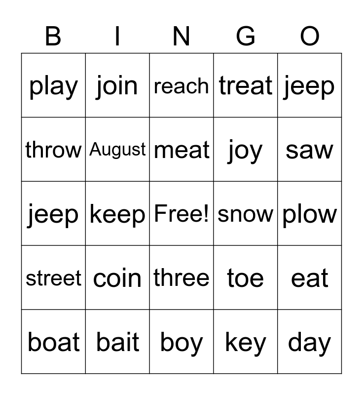 This bingo card has a free space and 24 words: coin, bait, meat, boat, jeep, play, throw, join, snow, three, joy, jeep, toe, eat, August, key, plow, reach, saw, keep, day, street, treat and boy.