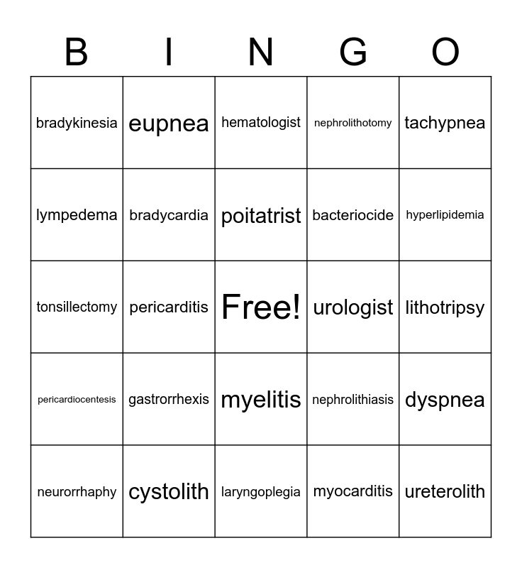 This bingo card has a free space and 32 words: myocarditis, endocarditis, pericarditis, polyarteritis, pericardiocentesis, bradycardia, tachypnea, dyspnea, eupnea, hypoxia, poitatrist, hematologist, oncologist, neurosurgeon, urologist, gastrorrhagia, neurorrhaphy, tonsillectomy, myelitis, gastrorrhexis, nephrolithiasis, nephrolith, lithotripsy, cystolith, ureterolith, nephrolithotomy, bacteriocide, lympedema, bradykinesia, laryngoplegia, angiostenosis and hyperlipidemia.