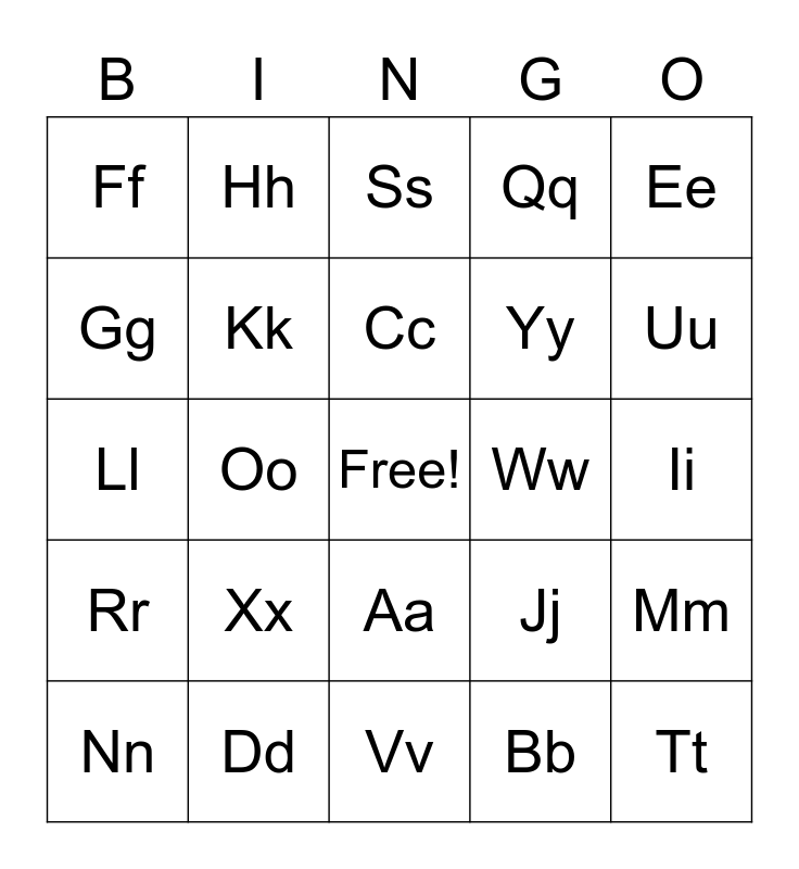 This bingo card has a free space and 26 words: Aa, Bb, Cc, Dd, Ee, Ff, Gg, Hh, Ii, Jj, Yy, Ll, Mm, Nn, Oo, Pp, Qq, Rr, Ss, Tt, Uu, Vv, Ww, Xx, Kk and Zz.
