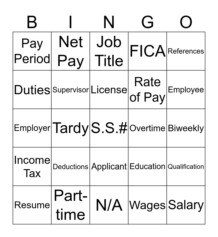 This bingo card has 29 words: Resume, Job Experience, Tardy, Salary, Pay Period, Job Title, Supervisor, Deductions, Overtime, Part-time, Biweekly, S.S.#, N/A, Wages, Employee, Gross Pay, Applicant, Income Tax, References, Employer, Education, Paycheck, Rate of Pay, Duties, FICA, Net Pay, Qualification, License and Full-time.