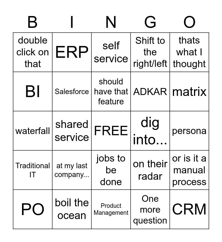 This bingo card has a free space and 34 words: Martech, One more question, Headless, Project vs Product Mindset, Traditional IT, Salesforce, thats what I thought, PO, ERP, I didn't hear if..., should have that feature, self service, Curious if/about..., CapEx, dig into..., matrix, boil the ocean, waterfall, at my last company..., on their radar, jobs to be done, how they align, double click on that, persona, Product Management, CRM, Shift to the right/left, steering committee, ADKAR, BI, what tool do you use for..., shared service, or is it a manual process and MOSCOW.