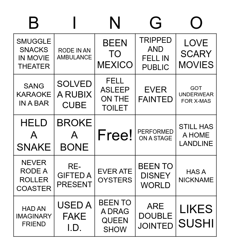 This bingo card has a free space and 24 words: RE-GIFTED A PRESENT, USED A FAKE I.D., FELL ASLEEP ON THE TOILET, HAD AN IMAGINARY FRIEND, LOVE SCARY MOVIES, SMUGGLE SNACKS IN MOVIE THEATER, SANG KARAOKE IN A BAR, RODE IN AN AMBULANCE, PERFORMED ON A STAGE, EVER ATE OYSTERS, EVER FAINTED, HELD A SNAKE, BEEN TO DISNEY WORLD, HAS A NICKNAME, SOLVED A RUBIX CUBE, ARE DOUBLE JOINTED, STILL HAS A HOME LANDLINE, BEEN TO MEXICO, GOT UNDERWEAR FOR X-MAS, BROKE A BONE, LIKES SUSHI, NEVER RODE A ROLLER COASTER, TRIPPED AND FELL IN PUBLIC and BEEN TO A DRAG QUEEN SHOW.