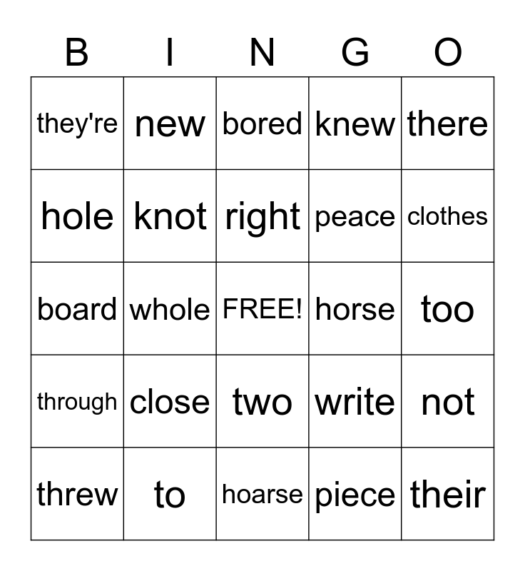 This bingo card has a free space and 24 words: close, to, right, threw, there, they're, hole, new, horse, two, peace, board, write, not, knot, piece, too, bored, clothes, whole, their, through, knew and hoarse.