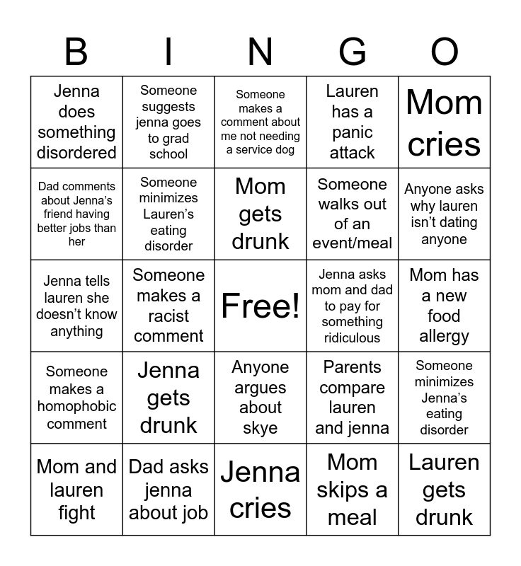 This bingo card has a free space and 24 words: Jenna gets drunk, Dad asks jenna about job, Mom gets drunk, Mom and lauren fight, Mom cries, Jenna does something disordered, Dad comments about Jenna’s friend having better jobs than her, Someone suggests jenna goes to grad school, Jenna asks mom and dad to pay for something ridiculous, Anyone argues about skye, Someone walks out of an event/meal, Jenna tells lauren she doesn’t know anything, Parents compare lauren and jenna, Someone minimizes Jenna’s eating disorder, Someone minimizes Lauren’s eating disorder, Mom skips a meal, Mom has a new food allergy, Someone makes a comment about me not needing a service dog, Anyone asks why lauren isn’t dating anyone, Someone makes a racist comment, Lauren gets drunk, Someone makes a homophobic comment, Lauren has a panic attack and Jenna cries.