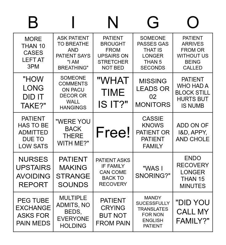 This bingo card has a free space and 24 words: PATIENT MAKING STRANGE SOUNDS, MULTIPLE ADMITS, NO BEDS, EVERYONE HOLDING, "WHAT TIME IS IT?", PEG TUBE EXCHANGE ASKS FOR PAIN MEDS, PATIENT ARRIVES FROM OR WITHOUT US BEING CALLED, MORE THAN 10 CASES LEFT AT 3PM, "HOW LONG DID IT TAKE?", ASK PATIENT TO BREATHE AND PATIENT SAYS "I AM BREATHING", CASSIE KNOWS PATIENT OR PATIENT FAMILY, PATIENT ASKS IF FAMILY CAN COME BACK TO RECOVERY, MISSING LEADS OR 02 MONITORS, PATIENT HAS TO BE ADMITTED DUE TO LOW SATS, "WAS I SNORING?", ENDO RECOVERY LONGER THAN 15 MINUTES, SOMEONE COMMENTS ON PACU DECOR OR WALL HANGINGS, MANDY SUCESSFULLY TRANSLATES FOR NON ENGLISH PATIENT, ADD ON OF I&D, APPY, AND CHOLE, PATIENT BROUGHT FROM UPSAIRS ON STRETCHER NOT BED, PATIENT WHO HAD A BLOCK STILL HURTS BUT IS NUMB, "WERE YOU BACK THERE WITH ME?", "DID YOU CALL MY FAMILY?", NURSES UPSTAIRS AVOIDING REPORT, SOMEONE PASSES GAS THAT IS LONGER THAN 5 SECONDS and PATIENT CRYING BUT NOT FROM PAIN.