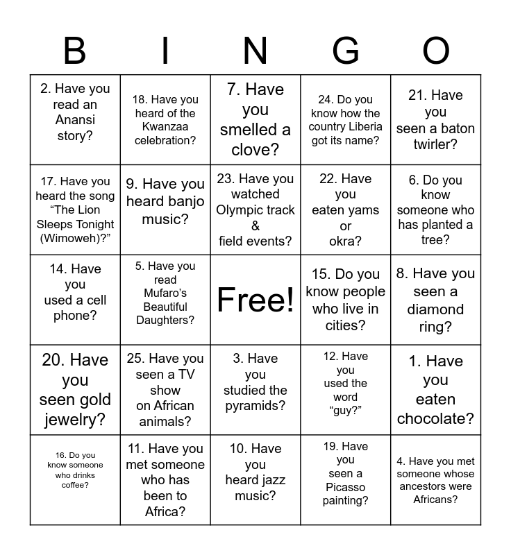 This bingo card has a free space and 24 words: 25. Have you seen a TV show on African animals?, 11. Have you met someone who has been to Africa?, 23. Have you watched Olympic track & field events?, 16. Do you know someone who drinks coffee?, 21. Have you seen a baton twirler?, 2. Have you read an Anansi story?, 17. Have you heard the song “The Lion Sleeps Tonight (Wimoweh)?”, 18. Have you heard of the Kwanzaa celebration?, 15. Do you know people who live in cities?, 3. Have you studied the pyramids?, 22. Have you eaten yams or okra?, 14. Have you used a cell phone?, 12. Have you used the word “guy?”, 1. Have you eaten chocolate?, 9. Have you heard banjo music?, 19. Have you seen a Picasso painting?, 8. Have you seen a diamond ring?, 7. Have you smelled a clove?, 6. Do you know someone who has planted a tree?, 5. Have you read Mufaro’s Beautiful Daughters?, 4. Have you met someone whose ancestors were Africans?, 20. Have you seen gold jewelry?, 24. Do you know how the country Liberia got its name? and 10. Have you heard jazz music?.