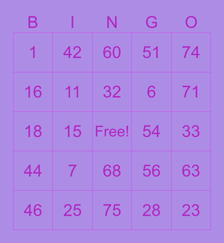 This bingo card has a free space and 24 words: 7, 25, 32, 46, 74, 1, 16, 42, 54, 68, 6, 18, 56, 63, 11, 28, 33, 60, 71, 15, 23, 44, 51 and 75.