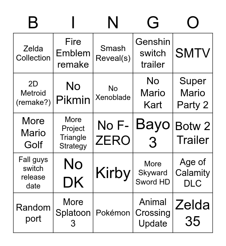 This bingo card has a free space and 24 words: No DK, More Splatoon 3, No Xenoblade, Random port, SMTV, Zelda Collection, 2D Metroid (remake?), Fire Emblem remake, Bayo 3, Kirby, No Mario Kart, More Mario Golf, More Skyward Sword HD, Age of Calamity DLC, No Pikmin, Animal Crossing Update, Botw 2 Trailer, Smash Reveal(s), Super Mario Party 2, More Project Triangle Strategy, Zelda 35, Fall guys switch release date, Genshin switch trailer and Pokémon.