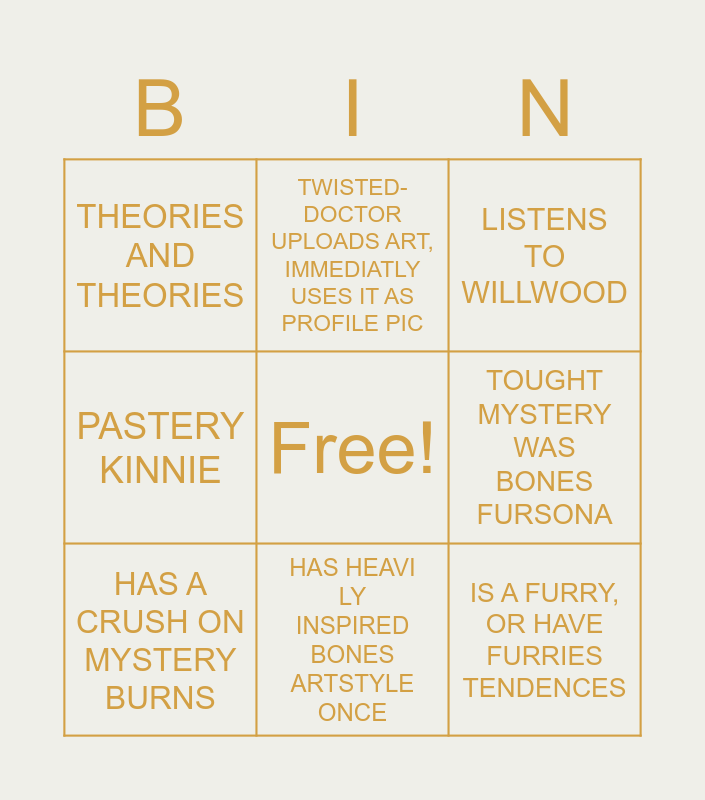 This bingo card has a free space and 9 words: HAS A CRUSH ON MYSTERY BURNS, LISTENS TO WILLWOOD, TWISTED-DOCTOR UPLOADS ART, IMMEDIATLY USES IT AS PROFILE PIC, PASTERY KINNIE, THEORIES AND THEORIES, TOUGHT MYSTERY WAS BONES FURSONA, IS A FURRY, OR HAVE FURRIES TENDENCES, STRANGER HATER and HAS HEAVILY INSPIRED BONES ARTSTYLE ONCE.
