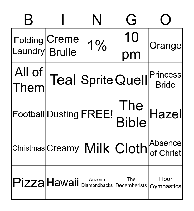 This bingo card has a free space and 33 words: Caramel, Winter, Dusting, Spinach, Christmas, Teal, Orange, Pizza, Creme Brulle, Vanilla, Sprite, 1%, French Toast, Bullying, The Bible, Princess Bride, Hawaii, Football, Creamy, Cloth, Milk, Summer, Folding Laundry, Hazel, Arizona Diamondbacks, Floor Gymnastics, 10 pm, Quell, All of Them, Absence of Christ, Samoas, The Decemberists and Emma Stone.