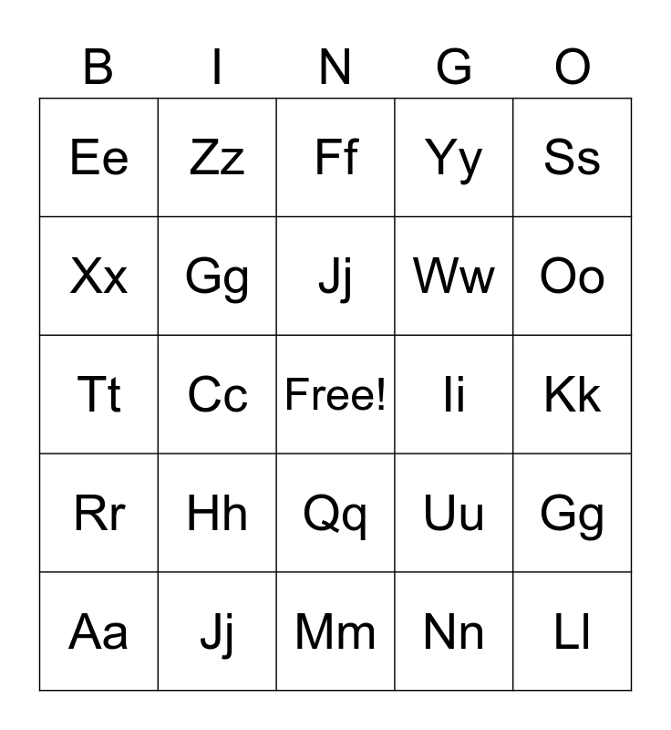 This bingo card has a free space and 29 words: Aa, Bb, Cc, Dd, Ee, Ff, Gg, Hh, Ii, Jj, Kk, Ll, Mm, Nn, Oo, Pp, Qq, Rr, Ss, Tt, Uu, Vv, Ww, Xx, Yy, Zz, Gg, Jj and Hh.