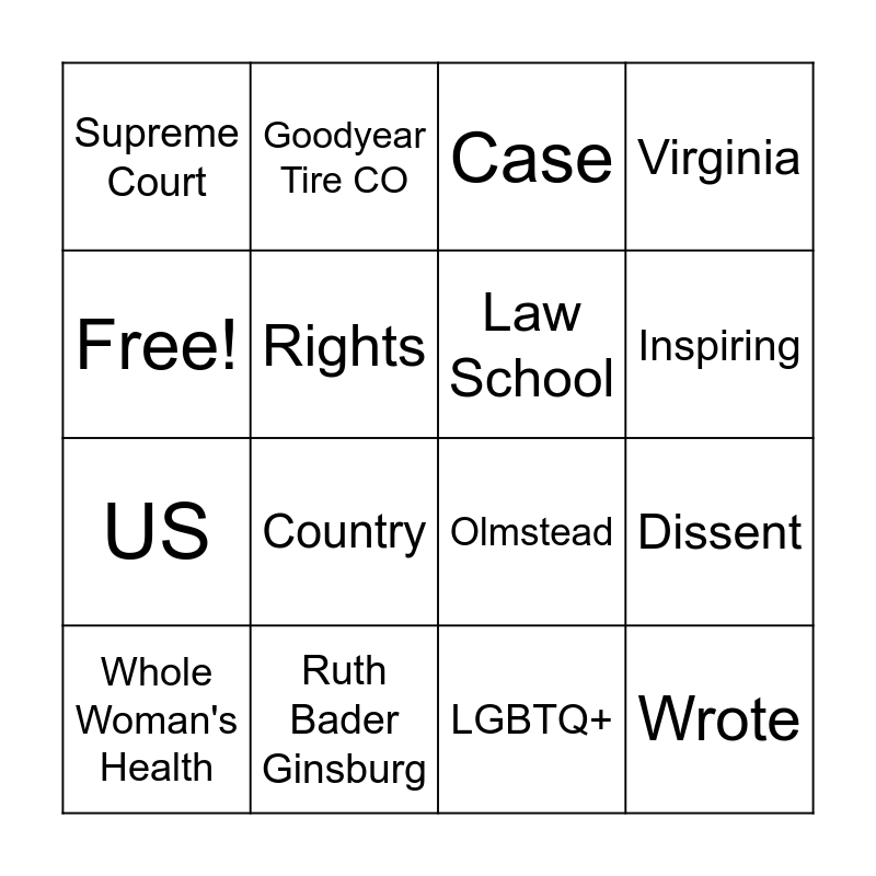 This bingo card has 16 words: Ruth Bader Ginsburg, Dissent, Case, Supreme Court, US, Goodyear Tire CO, Olmstead, LGBTQ+, Free!, Rights, Whole Woman's Health, Virginia, Country, Inspiring, Law School and Wrote.