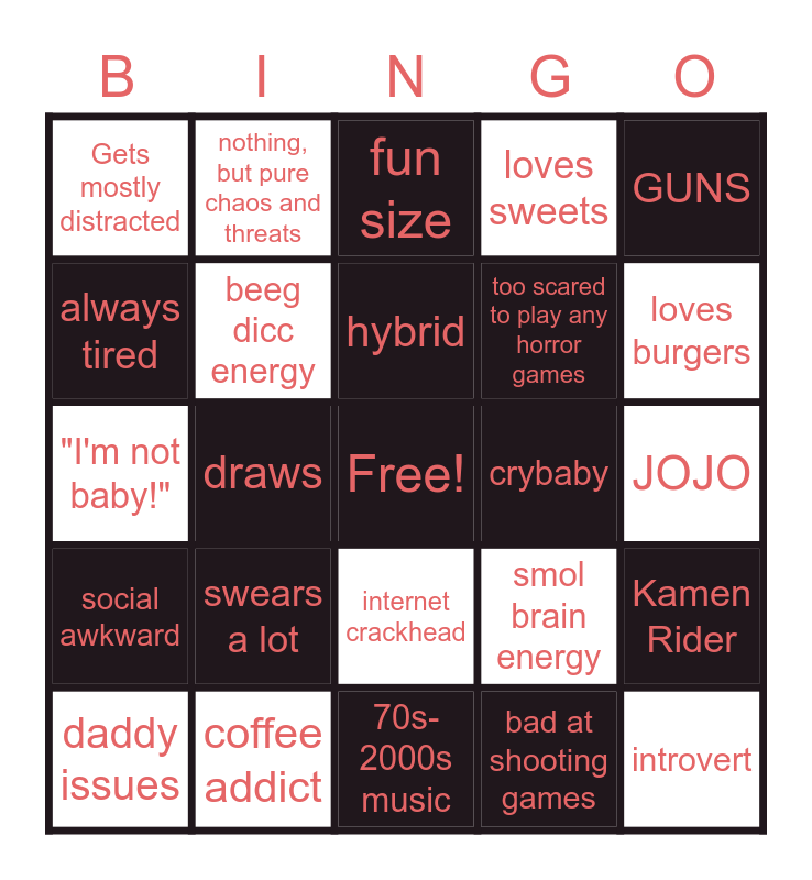 This bingo card has a free space and 24 words: swears a lot, coffee addict, hybrid, daddy issues, GUNS, Gets mostly distracted, always tired, nothing, but pure chaos and threats, crybaby, internet crackhead, too scared to play any horror games, "I'm not baby!", smol brain energy, Kamen Rider, beeg dicc energy, bad at shooting games, JOJO, fun size, loves burgers, draws, introvert, social awkward, loves sweets and 70s-2000s music.