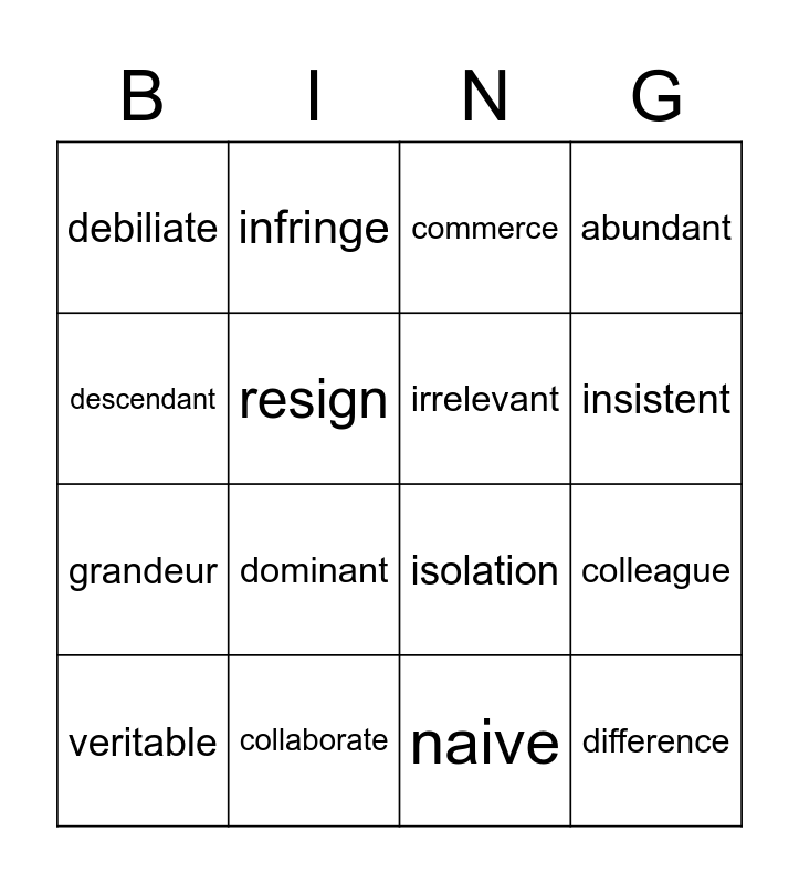 This bingo card has 16 words: collaborate, colleague, commerce, debiliate, grandeur, infringe, isolation, naive, descendant, resign, veritable, abundant, dominant, insistent, irrelevant and difference.