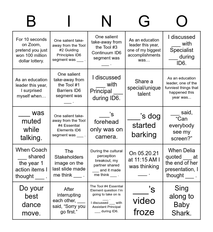 This bingo card has 25 words: The Stakeholders image on the last slide made me think ___ ., The Tool #4 Essential Element question I’m going to take on is ___ . I discussed ___ with Assistant Principal ___ during ID6., I discussed ___ with Principal ___ during ID6., Do your best dance move., I discussed ___ with Specialist ___ during ID6., For 10 seconds on Zoom, pretend you just won 100 million dollar lottery., As an education leader this year, I surprised myself when…, One salient take-away from the Tool #2 Guiding Principles ID6 segment was ___ ., ___’s dog started barking, During the cultural perception breakout, my partner shared ___ and it made me think ___ ., Share a special/unique talent, ___ was muted while talking., On 05.20.21 at 11:15 AM I was thinking ___ ., When Delia quoted ___ at the end of her presentation, I thought ___ ., One salient take-away from the Tool #1 Barriers ID6 segment was ___ ., Sing along to Baby Shark., ___ said, “Can everybody see my screen?”, One salient take-away from the Tool #3 Continuum ID6 segment was ___ ., As an education leader, one of the funniest things that happened this year was..., One salient take-away from the Tool #4 Essential Elements ID6 segment was ___ ., ___’s forehead only was on camera., After interrupting each other, ___ said, “Sorry you go first.”, When Coach ___ shared the year 1 action items I thought ___ ., As an education leader this year, one of my biggest accomplishments was… and ___’s video froze.