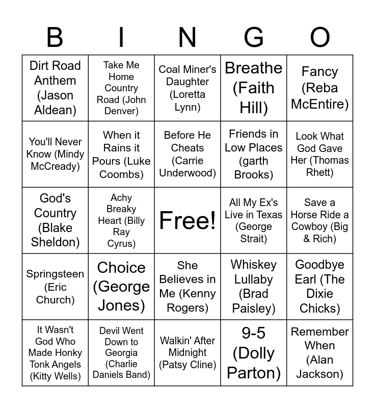 This bingo card has a free space and 24 words: Choice (George Jones), Devil Went Down to Georgia (Charlie Daniels Band), Before He Cheats (Carrie Underwood), It Wasn't God Who Made Honky Tonk Angels (Kitty Wells), Fancy (Reba McEntire), Dirt Road Anthem (Jason Aldean), You'll Never Know (Mindy McCready), Take Me Home Country Road (John Denver), All My Ex's Live in Texas (George Strait), She Believes in Me (Kenny Rogers), Friends in Low Places (garth Brooks), God's Country (Blake Sheldon), Whiskey Lullaby (Brad Paisley), Goodbye Earl (The Dixie Chicks), When it Rains it Pours (Luke Coombs), 9-5 (Dolly Parton), Save a Horse Ride a Cowboy (Big & Rich), Coal Miner's Daughter (Loretta Lynn), Look What God Gave Her (Thomas Rhett), Achy Breaky Heart (Billy Ray Cyrus), Remember When (Alan Jackson), Springsteen (Eric Church), Breathe (Faith Hill) and Walkin' After Midnight (Patsy Cline).
