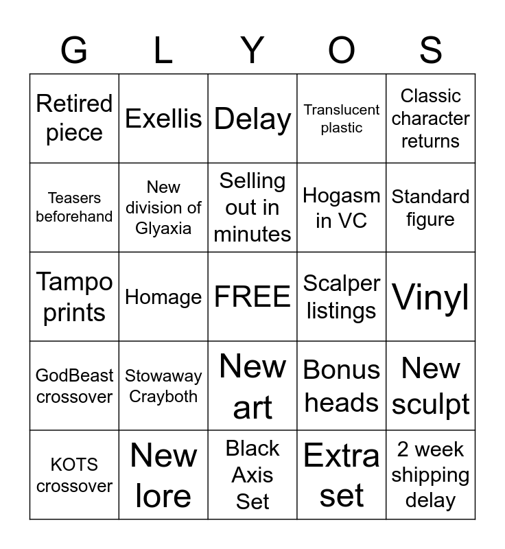 This bingo card has a free space and 24 words: Stowaway Crayboth, New lore, Selling out in minutes, KOTS crossover, Classic character returns, Retired piece, Teasers beforehand, Exellis, Scalper listings, New art, Hogasm in VC, Tampo prints, Bonus heads, New sculpt, New division of Glyaxia, Extra set, Vinyl, Delay, Standard figure, Homage, 2 week shipping delay, GodBeast crossover, Translucent plastic and Black Axis Set.