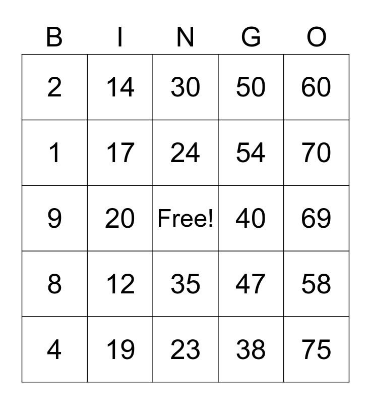 This bingo card has a free space and 24 words: 4, 12, 24, 38, 60, 2, 14, 30, 40, 69, 9, 17, 47, 58, 1, 19, 23, 50, 70, 8, 20, 35, 54 and 75.