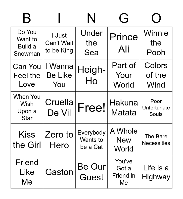 This bingo card has a free space and 27 words: A Whole New World, You’ll Be In My Heart, Part of Your World, Be Our Guest, Can You Feel the Love, Under the Sea, I Just Can't Wait to be King, Kiss the Girl, Hakuna Matata, The Bare Necessities, When You Wish Upon a Star, Prince Ali, Friend Like Me, Gaston, Colors of the Wind, Let it Go, I Wanna Be Like You, Heigh-Ho, Zero to Hero, Do You Want to Build a Snowman, Poor Unfortunate Souls, You've Got a Friend in Me, Cruella De Vil, Life is a Highway, Everybody Wants to be a Cat, Winnie the Pooh and How Far I’ll Go.