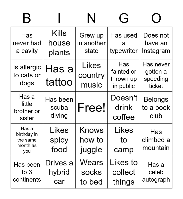 This bingo card has a free space and 29 words: Has been to 3 continents, Speaks more than one language, Has been scuba diving, Has been to Alaska, Has never had a cavity, Grew up in another state, Has a tattoo, Likes spicy food, Doesn't drink coffee, Drives a hybrid car, Belongs to a book club, Has a celeb autograph, Wears socks to bed, Likes to collect things, Has never gotten a speeding ticket, Played a sport in school, Knows how to juggle, Has a birthday in the same month as you, Does not have an Instagram, Has a little brother or sister, Likes to camp, Has had stitches, Has fainted or thrown up in public, Is allergic to cats or dogs, Has used a typewriter, Kills house plants, Has climbed a mountain, Likes country music and Can touch their nose with their tongue.