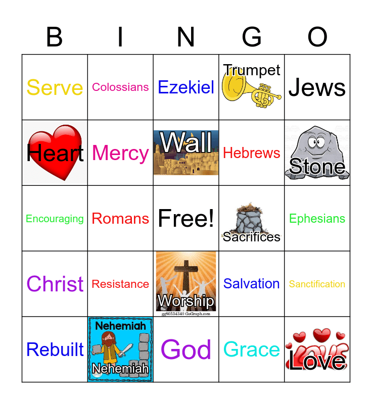 This bingo card has 8 images, a free space and 24 words: Resistance, Nehemiah, Wall, Rebuilt, Jews, Serve, Heart, Colossians, Sacrifices, Worship, Hebrews, Encouraging, Salvation, Sanctification, Mercy, Grace, Ephesians, Ezekiel, Stone, Romans, Love, Christ, Trumpet and God.