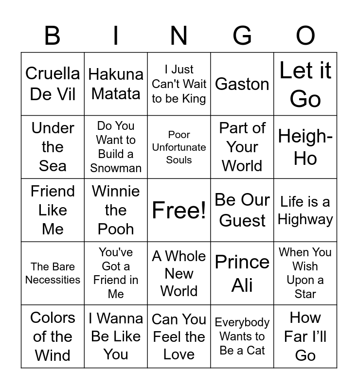 This bingo card has a free space and 27 words: Prince Ali, Kiss the Girl, Part of Your World, Can You Feel the Love, Under the Sea, I Just Can't Wait to be King, Hakuna Matata, The Bare Necessities, Be Our Guest, When You Wish Upon a Star, Friend Like Me, Gaston, Colors of the Wind, I Wanna Be Like You, Heigh-Ho, Zero to Hero, Do You Want to Build a Snowman, Poor Unfortunate Souls, You've Got a Friend in Me, Cruella De Vil, Life is a Highway, Everybody Wants to Be a Cat, Winnie the Pooh, How Far I’ll Go, A Whole New World, Let it Go and You’ll Be In My Heart.