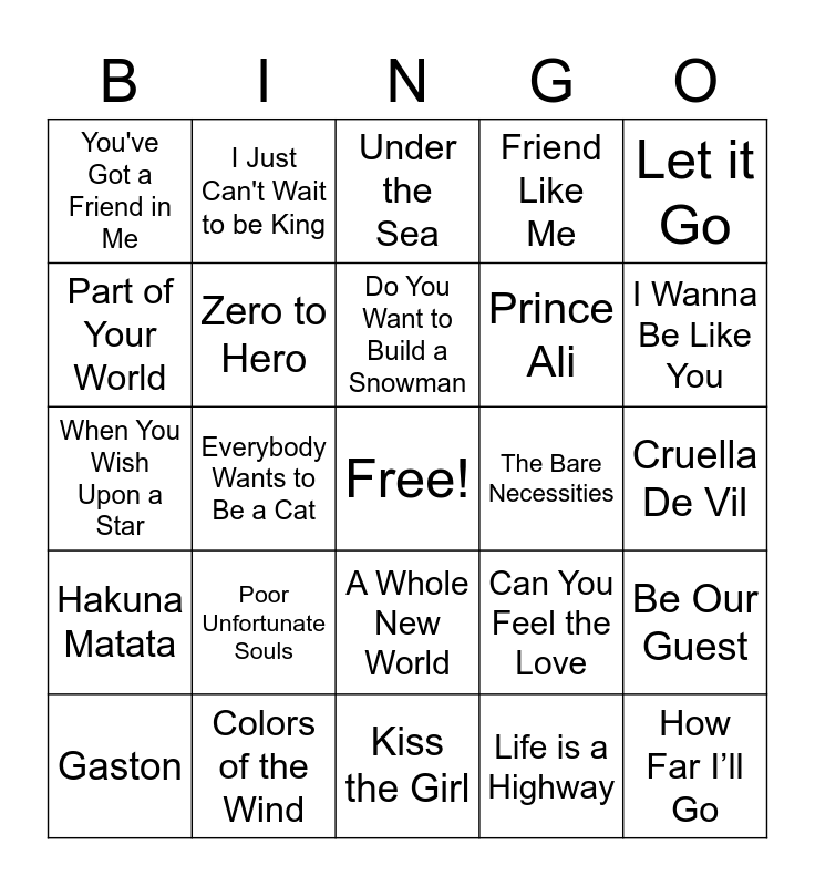 This bingo card has a free space and 27 words: Can You Feel the Love, Winnie the Pooh, Prince Ali, Kiss the Girl, Part of Your World, Under the Sea, I Just Can't Wait to be King, Hakuna Matata, The Bare Necessities, Be Our Guest, When You Wish Upon a Star, Friend Like Me, Gaston, Colors of the Wind, I Wanna Be Like You, Heigh-Ho, Zero to Hero, Do You Want to Build a Snowman, Poor Unfortunate Souls, You've Got a Friend in Me, Cruella De Vil, Life is a Highway, Everybody Wants to Be a Cat, How Far I’ll Go, A Whole New World, Let it Go and You’ll Be In My Heart.