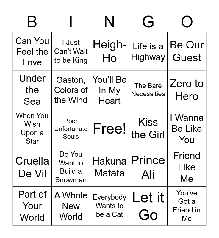 This bingo card has a free space and 24 words: Do You Want to Build a Snowman, A Whole New World, You’ll Be In My Heart, Part of Your World, Be Our Guest, Can You Feel the Love, Under the Sea, I Just Can't Wait to be King, Kiss the Girl, Hakuna Matata, The Bare Necessities, When You Wish Upon a Star, Prince Ali, Friend Like Me, Gaston, Colors of the Wind, Let it Go, I Wanna Be Like You, Heigh-Ho, Zero to Hero, Poor Unfortunate Souls, You've Got a Friend in Me, Cruella De Vil, Life is a Highway and Everybody Wants to be a Cat.