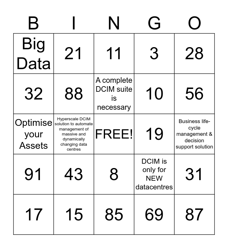 This bingo card has a free space and 24 words: 43, 15, A complete DCIM suite is necessary, 17, 28, Big Data, 32, 21, 19, 8, 10, Optimise your Assets, DCIM is only for NEW datacentres, 31, 88, 69, Business life-cycle management & decision support solution, 11, 56, Hyperscale DCIM solution to automate management of massive and dynamically changing data centres, 87, 91, 3 and 85.