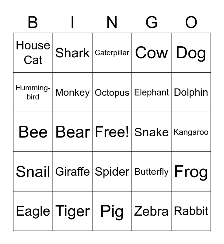 This bingo card has a free space and 24 words: Giraffe, Tiger, Octopus, Eagle, Dog, House Cat, Humming- bird, Shark, Snake, Spider, Elephant, Bee, Butterfly, Frog, Monkey, Zebra, Kangaroo, Caterpillar, Dolphin, Bear, Rabbit, Snail, Cow and Pig.