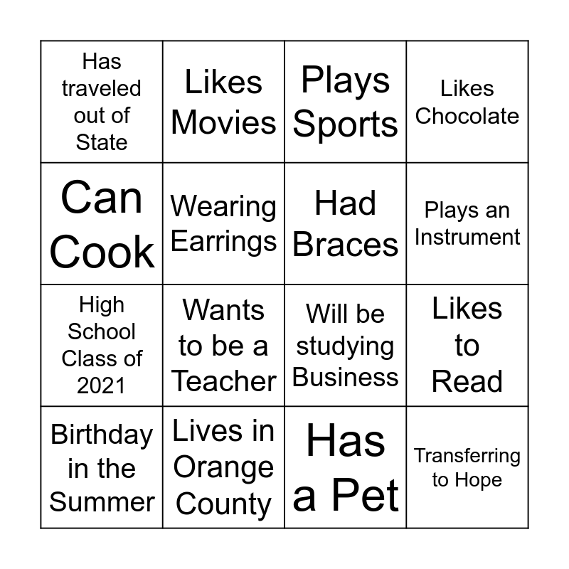 This bingo card has 16 words: Lives in Orange County, Likes to Read, Plays Sports, Has traveled out of State, High School Class of 2021, Likes Movies, Will be studying Business, Has a Pet, Can Cook, Wearing Earrings, Birthday in the Summer, Likes Chocolate, Wants to be a Teacher, Plays an Instrument, Had Braces and Transferring to Hope.