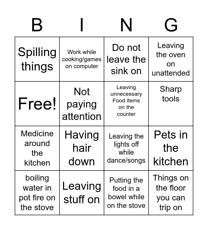 This bingo card has 16 words: Leaving stuff on, Pets in the kitchen, Do not leave the sink on, Spilling things, Medicine around the kitchen, Work while cooking/games on computer, Leaving the lights off while dance/songs, Putting the food in a bowel while on the stove, Free!, Not paying attention, boiling water in pot fire on the stove, Leaving the oven on unattended, Having hair down, Sharp tools, Leaving unnecessary Food items on the counter and Things on the floor you can trip on.