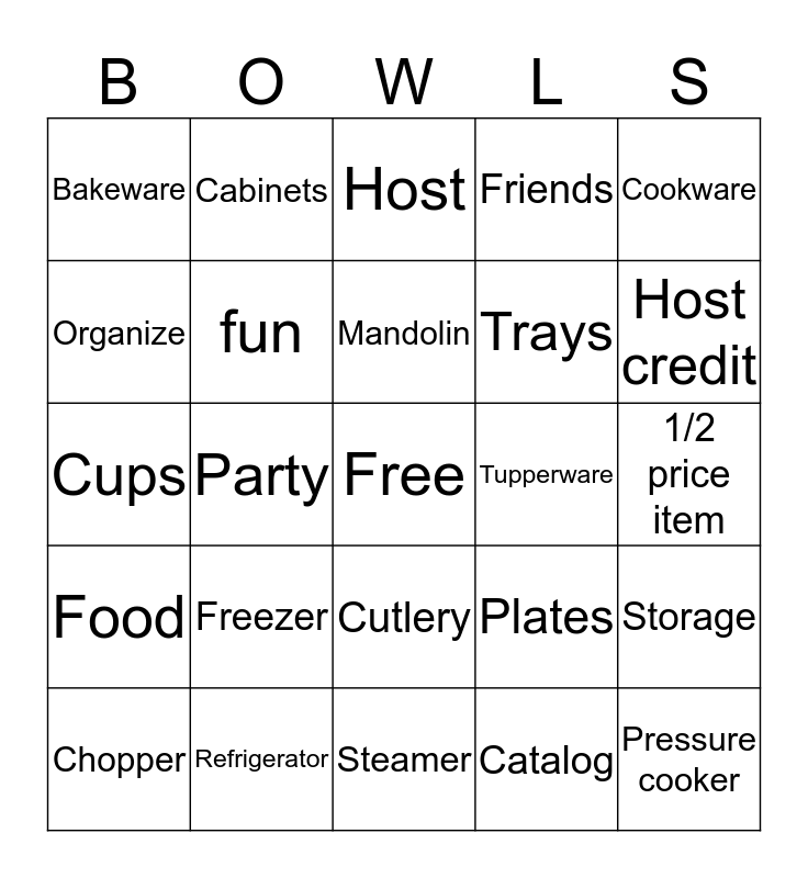 This bingo card has a free space and 24 words: Freezer, Refrigerator, Mandolin, Chopper, Cookware, Bakeware, Organize, Cabinets, Tupperware, Cutlery, Trays, Cups, Plates, Storage, fun, Catalog, 1/2 price item, Host, Host credit, Party, Pressure cooker, Food, Friends and Steamer.